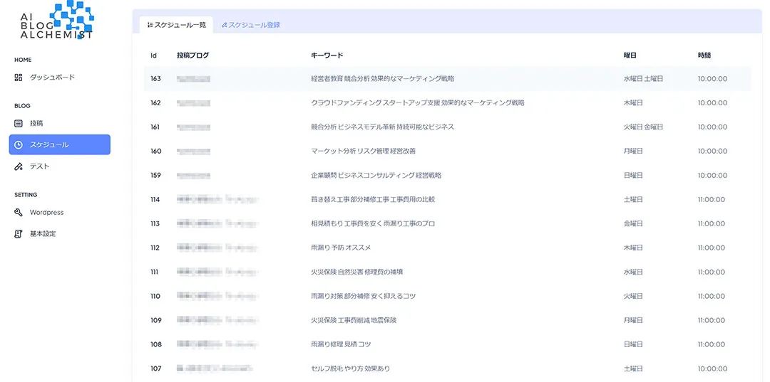 3つのキーワード設定で毎週日曜日のみ投稿する場合